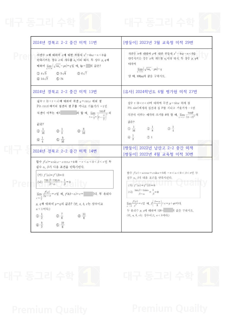 범위 : 수열의 극한 ~ 음함수의 미분법난이도 : 중상부교재 : 21~24년도 기출학습지기출학습지에서 대부분 내는 추세입니다.그러므로 학습지 변형 문제를 많이 풀어풀이가 숙달 될 수 있도록 연습하셔야 합니다. |