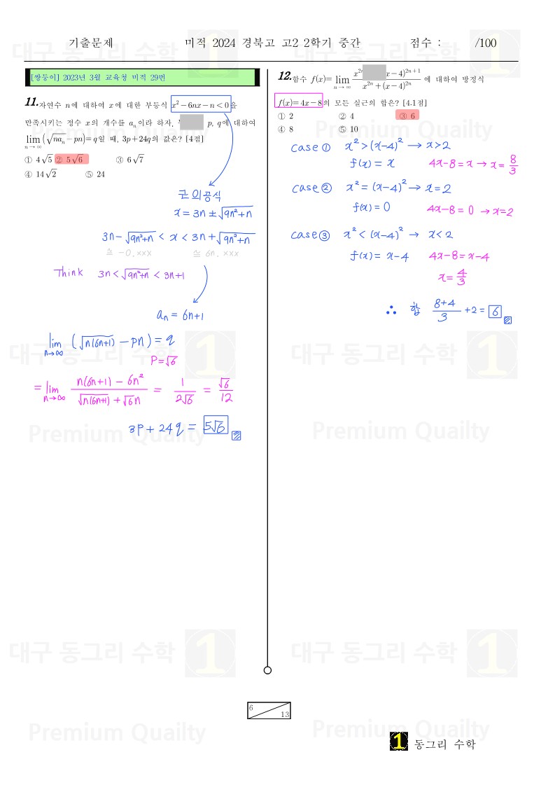 이상으로 2024년 경북고2-2 중간고사 미적 기출분석을 마칩니다.조금이나마 저의 도움으로학생들의 공부에도움이 되었으면 좋겠습니다. |