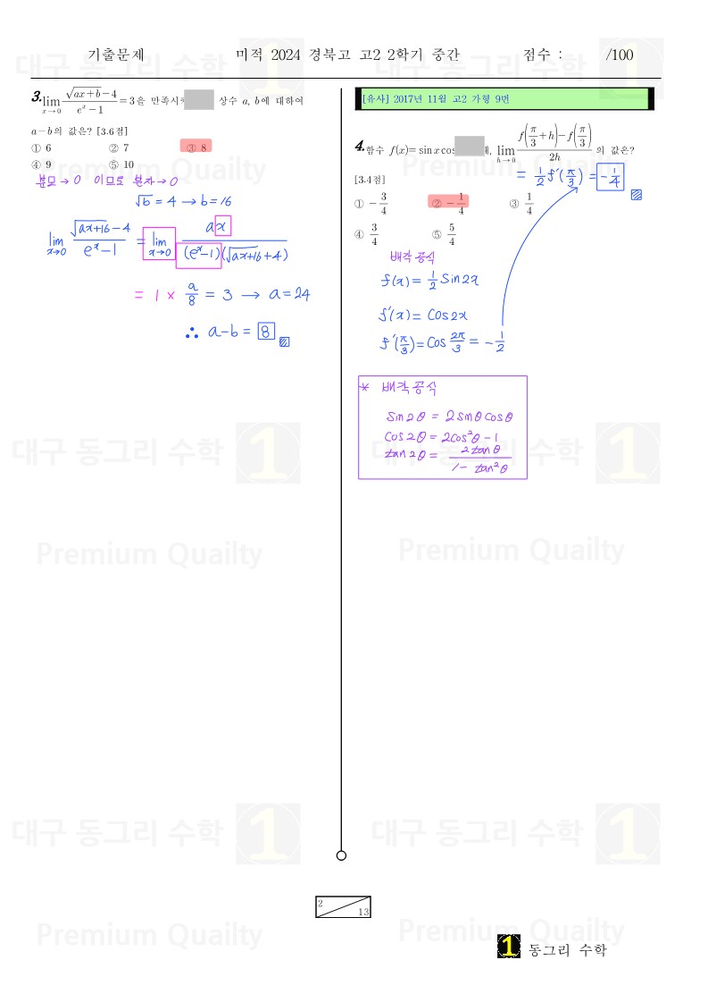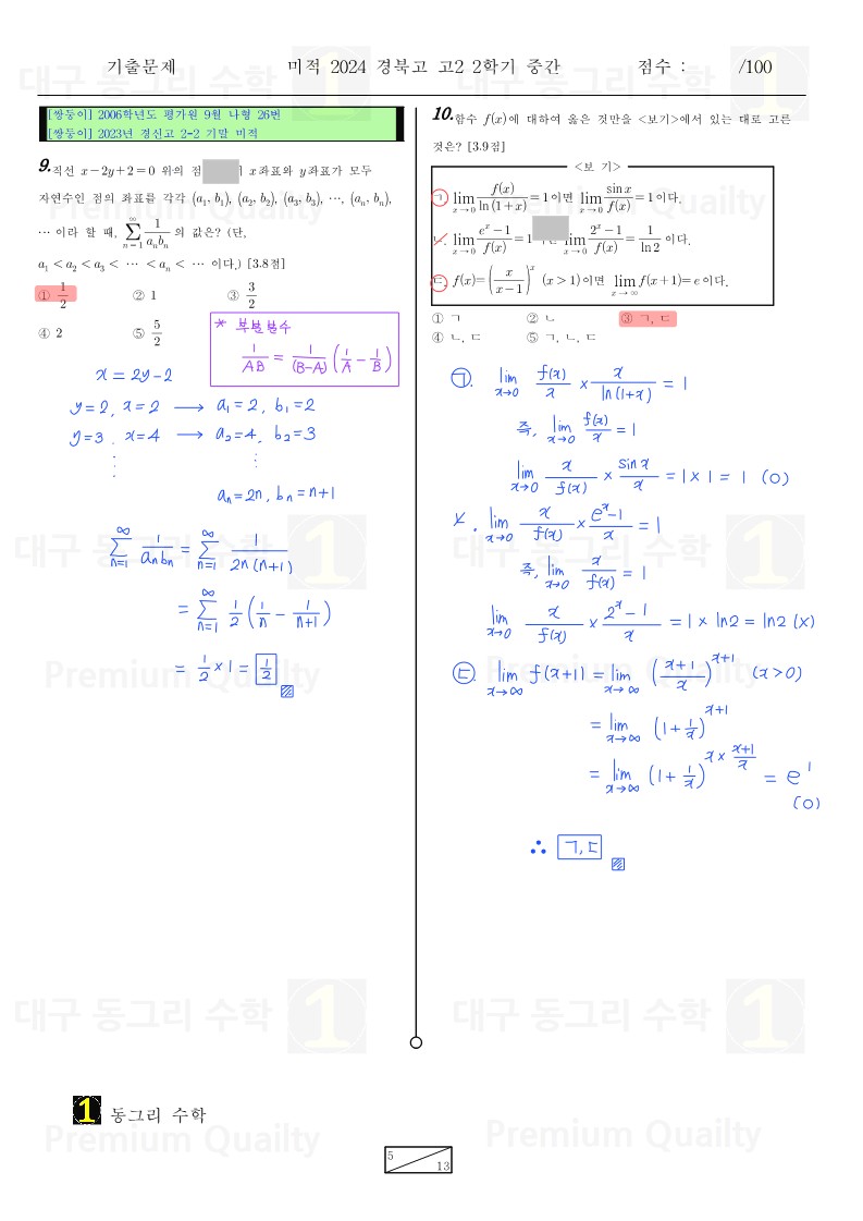 안녕하세요 대구 동그리 수학 이동권 강사입니다.대구 수성구 경북고2024년 2-2 중간고사 미적기출 분석 및 손풀이 내용입니다. |