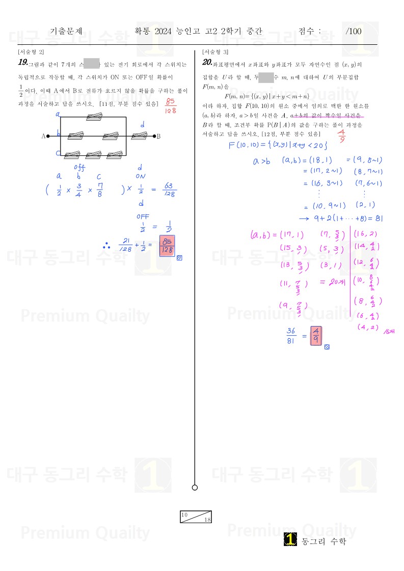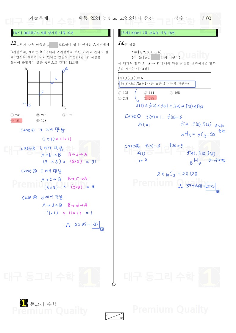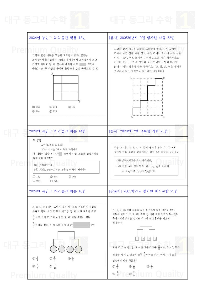 범위 : 여러가지순열 ~ 조건부확률난이도 : 중상특이사항 : 난이도가 많이 어렵지는 않습니다.기출, 시중문제집 위주의 학습을 하면서도움이 될 것 같습니다. |