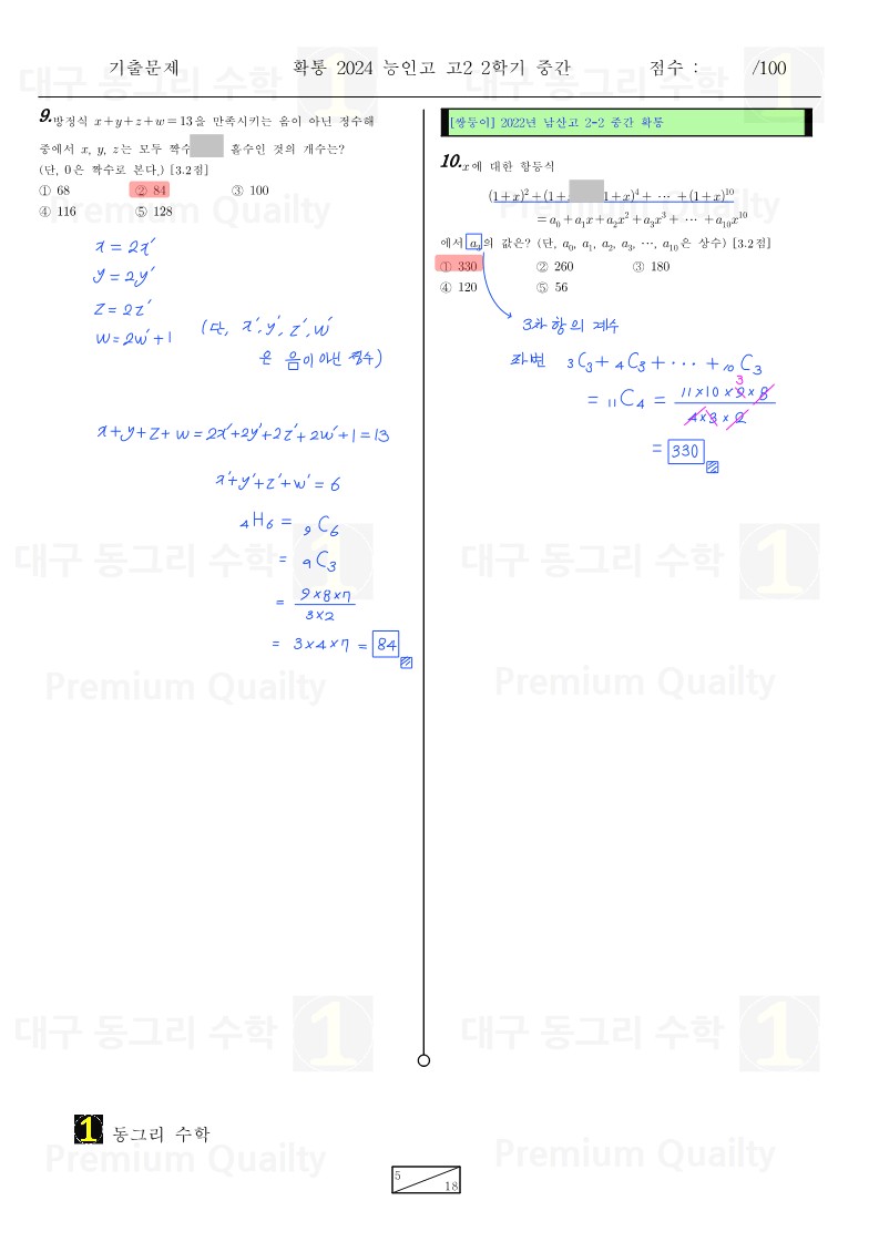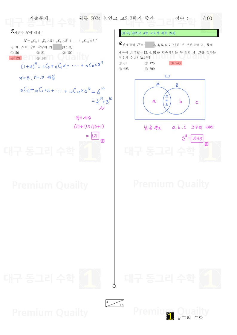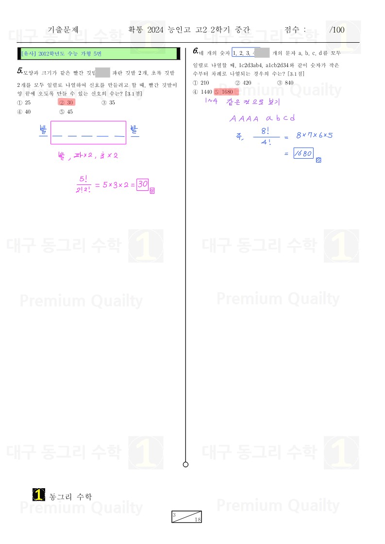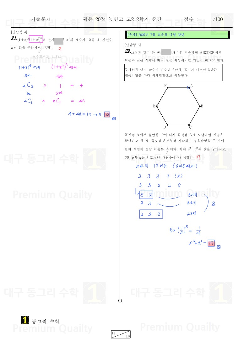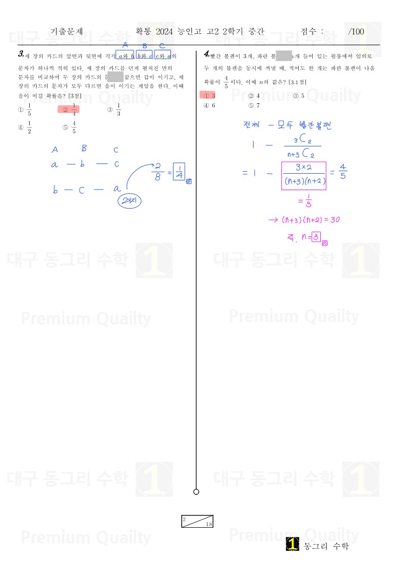 안녕하세요 대구 동그리 수학 이동권 강사입니다.대구 수성구 능인고2024년 2-2 중간고사 확통기출 분석 및 손풀이 내용입니다. |