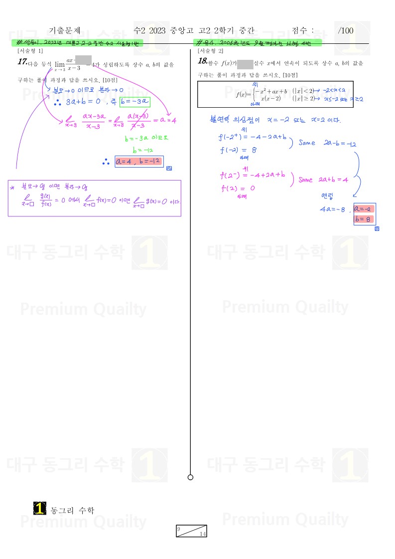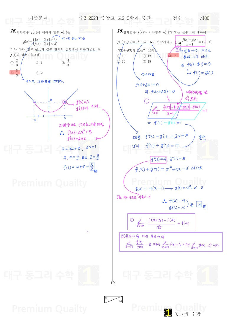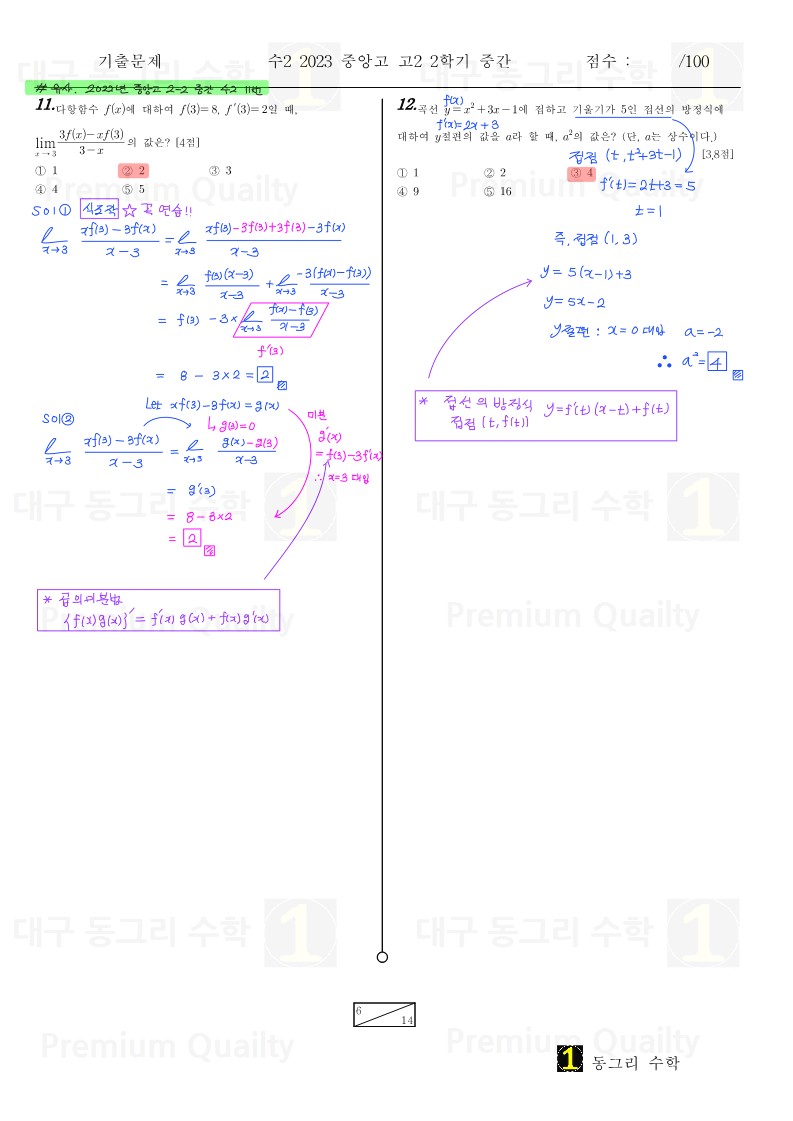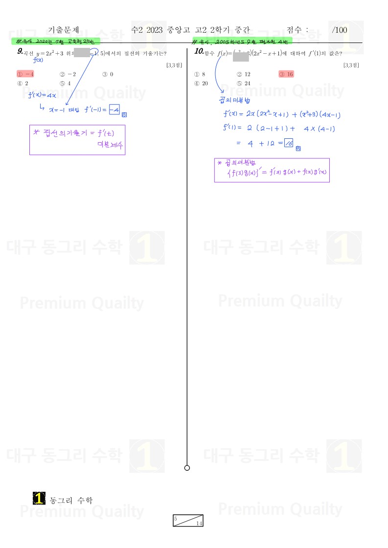 범위 : 함수의 극한 ~ 접선의 방정식난이도 : 하특이사항 : 모의고사 기출문제랑 똑같은 문제가 다수 있고22 중앙고 문항들이 연계된 것을 확인 할 수 있습니다.추가적으로 인근학교 내신기출문제도 보입니다.난이도가 많이 쉽습니다. |